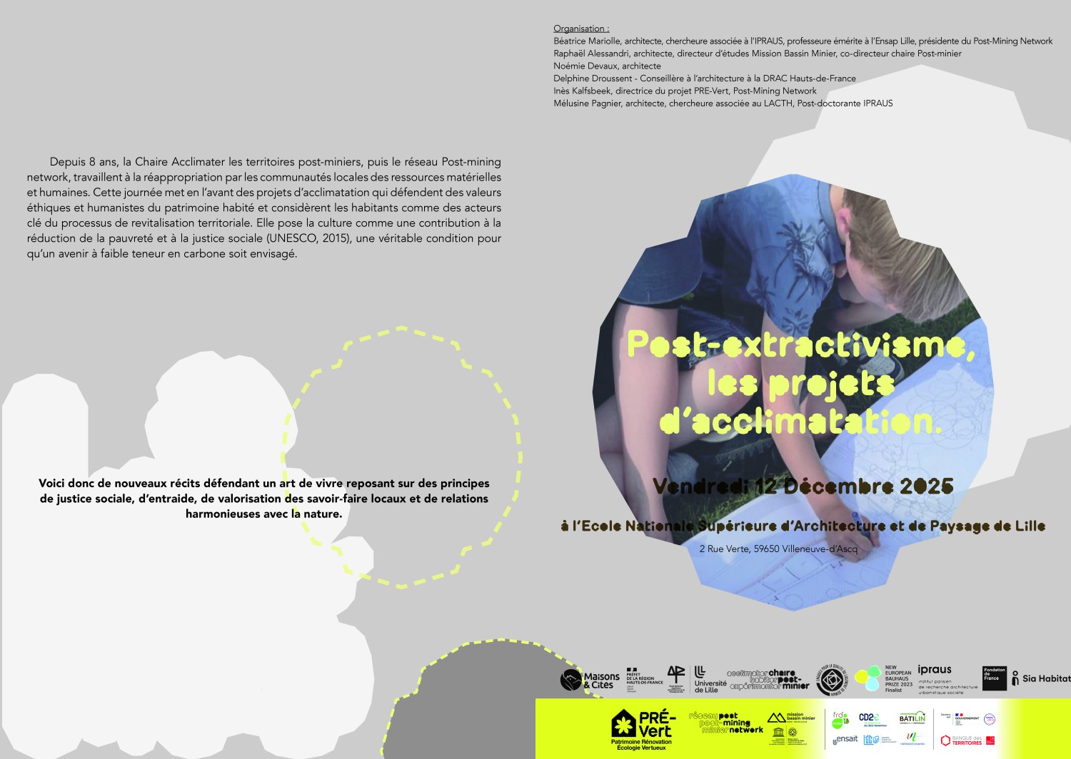 Nous avons le plaisir de vous convier à la journée de bilan des 8 ans de la Chaire Acclimater les territoires post-minières qui aura lieu le 12 décembre 2025 à partir de 9h, à l’ENSAPL et en visioconférence.