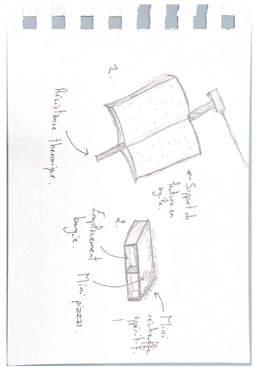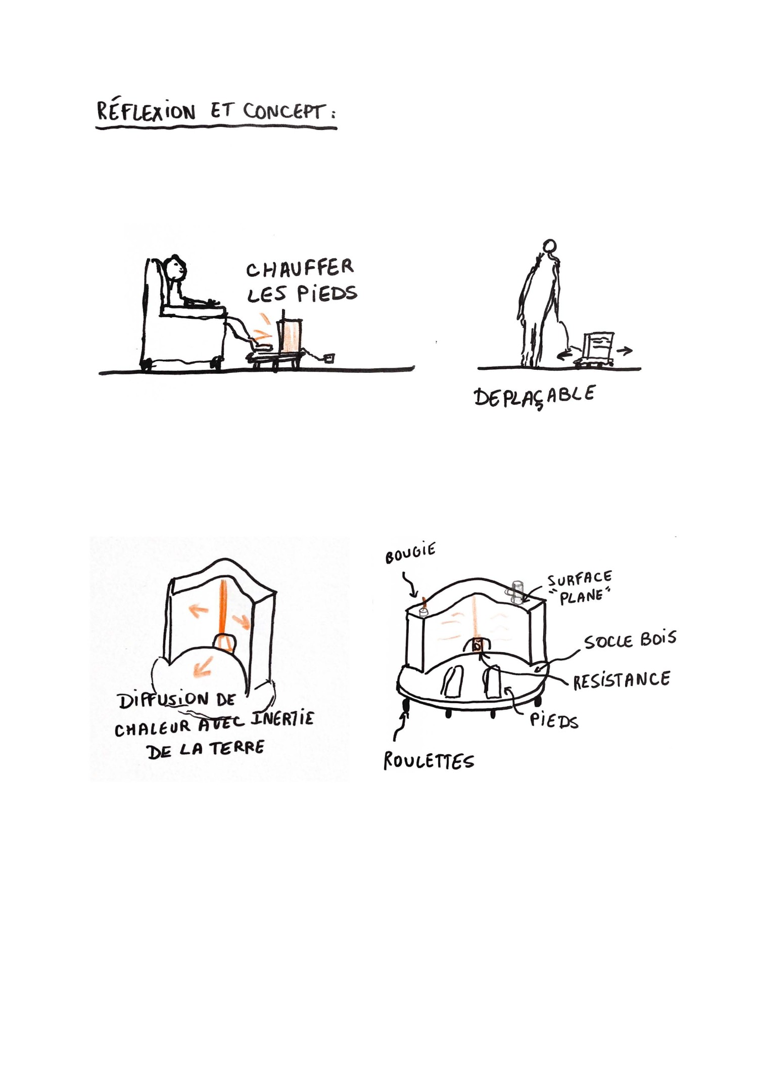 Claude a froid au moment de manger. Les plats qu’il se prépare se refroidissent trop vite à son goût. Son chauffe-plat en pisé, posé sur sa table, le réchauffe en diffusant par rayonnement la chaleur d’une résistance électrique. Claude peut également se réchauffer les mains par contact direct (conduction). Trois bougies, installées sous une plaque de cuivre, maintiennent au chaud ses plats. Et Claude profite de leur lumière chaleureuse.