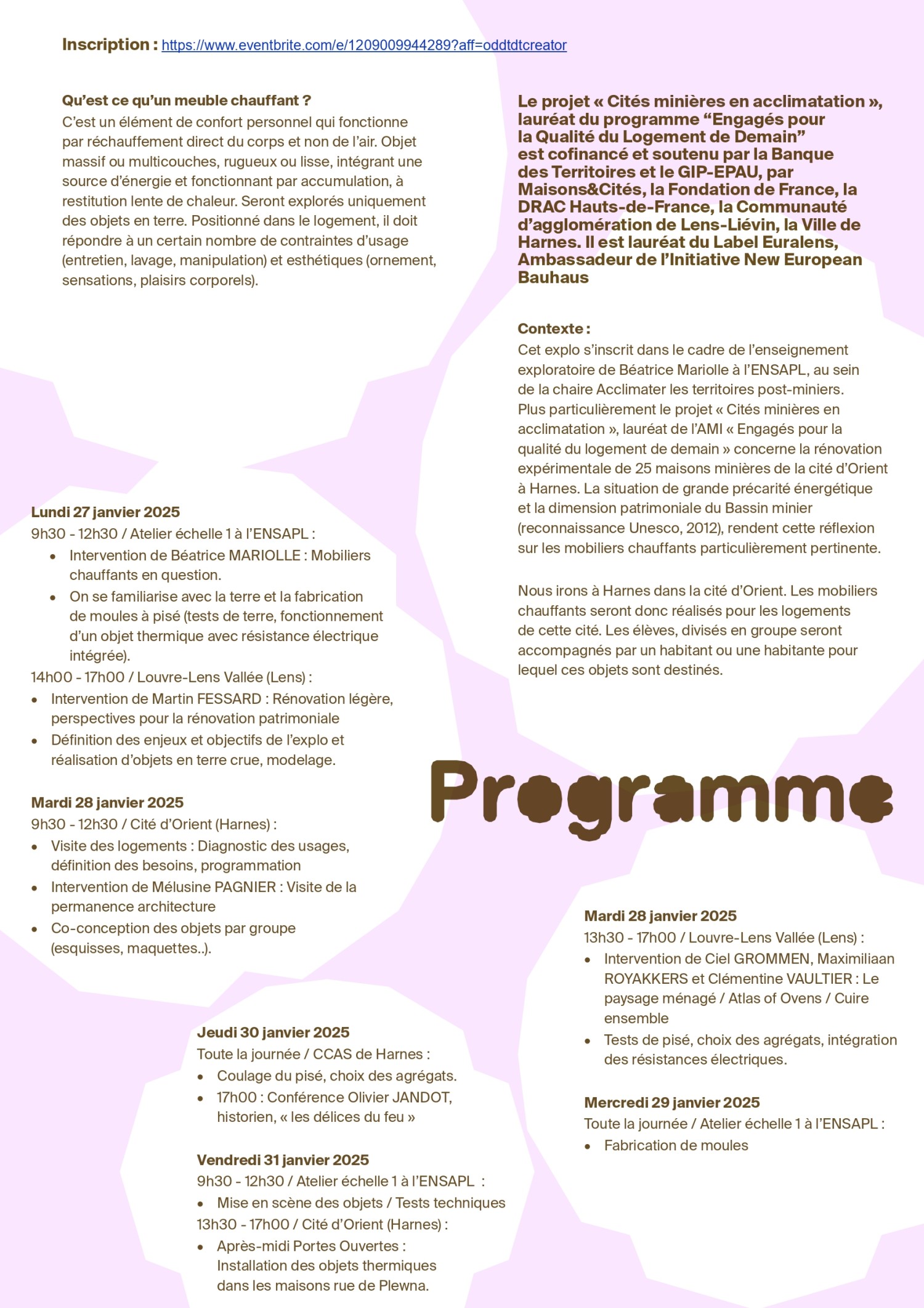 Du 27 au 31 janvier 2025, un atelier autour des mobiliers chauffants a eu lieu à Harnes et à Louvre-Lens Vallée, associant fabrication, rencontres avec les habitants et conférences inspirantes.