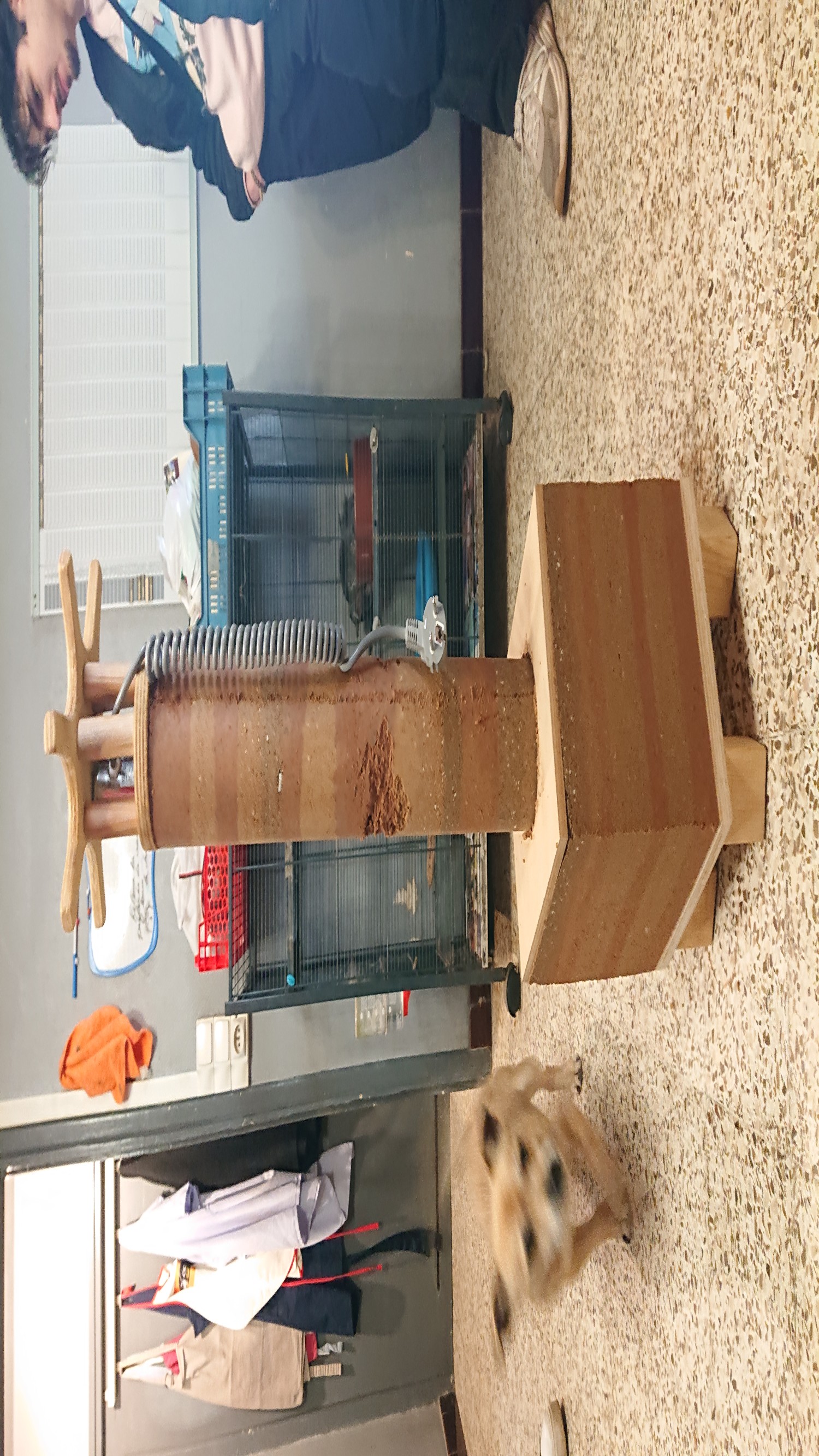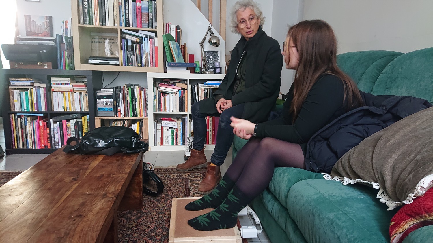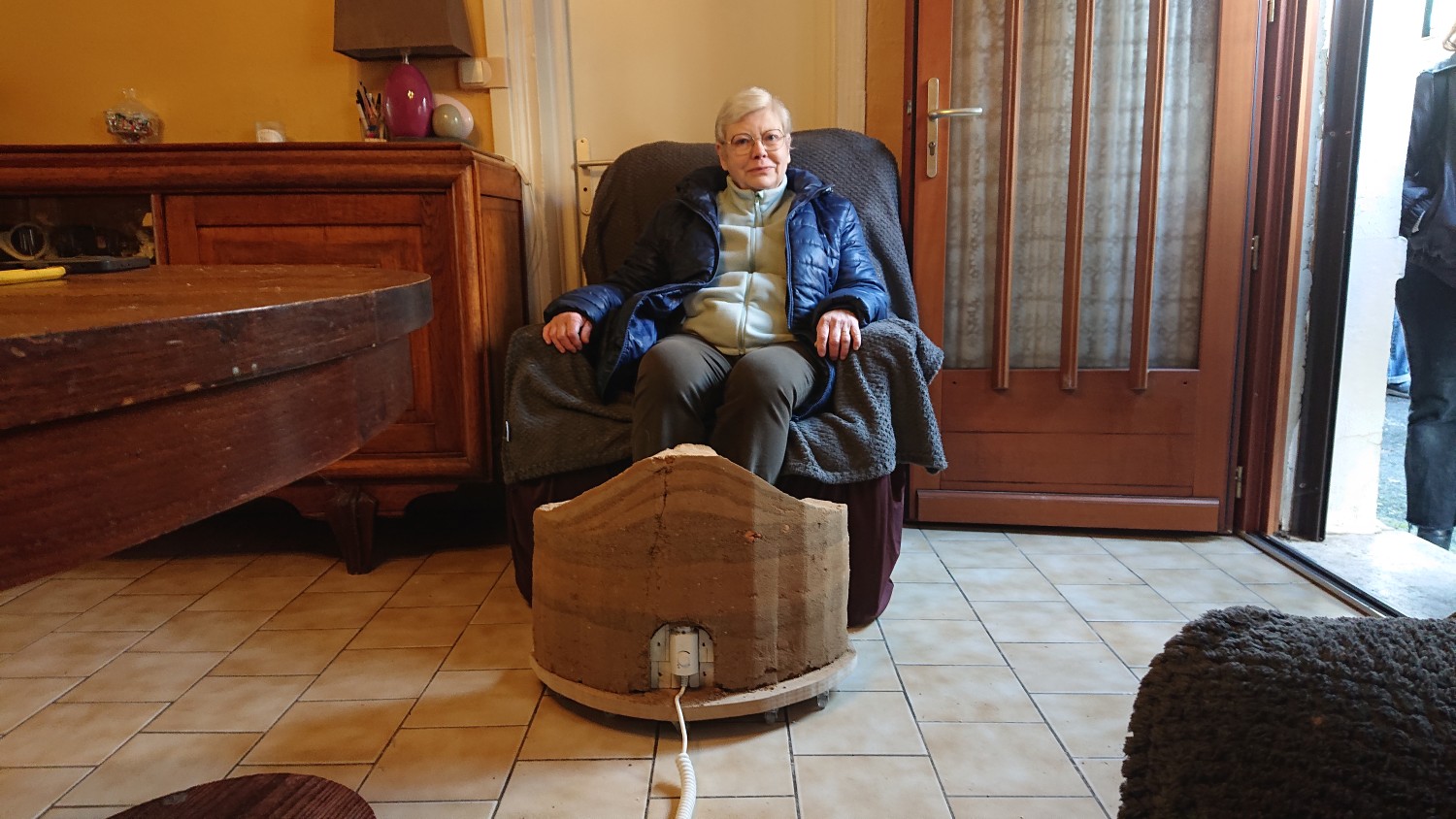 Lucienne aime s’asseoir dans son fauteuil, à proximité de la porte vitrée. Elle y fait la sieste en journée ou y regarde la télé le soir. Elle se refroidit pendant ces activités statiques. Son panneau en pisé entoure ses pieds et ses jambes pour les réchauffer par rayonnement ou conduction. Une base en bois décolle ses pieds du sol en carrelage froid. Ce mobilier monté sur roulettes peut être déplacé sous la table lors des repas.
