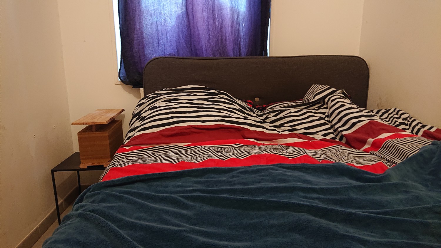 Jonathan a froid au moment de se coucher. Sa chambre est peu chauffée. Un mobilier en pisé posé sur sa table de chevet tente de réchauffer localement la chambre. Il contribue à générer une atmosphère chaleureuse, à l’instar d’une lampe de chevet qu’on allume avant de se coucher.