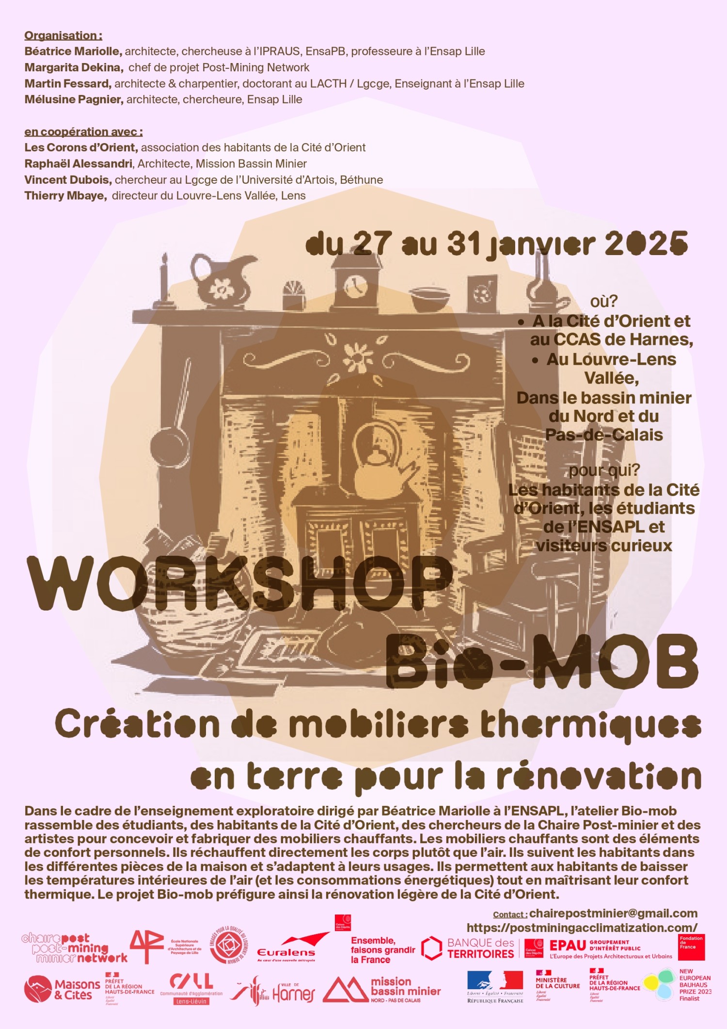 Dans le cadre de l’enseignement exploratoire dirigé par Béatrice Mariolle à l’ENSAPL, le projet Bio-MOB a rassemblé des étudiants de l’Ensapl, l'association des habitants les Corons d'Orient, des habitants de la Cité d’Orient, des chercheurs de la Chaire Post-minier, l'association Post-Mining Network et des artistes pour concevoir et fabriquer des mobiliers chauffants.