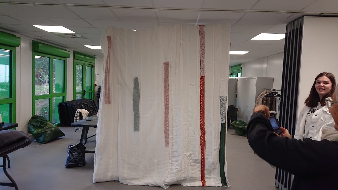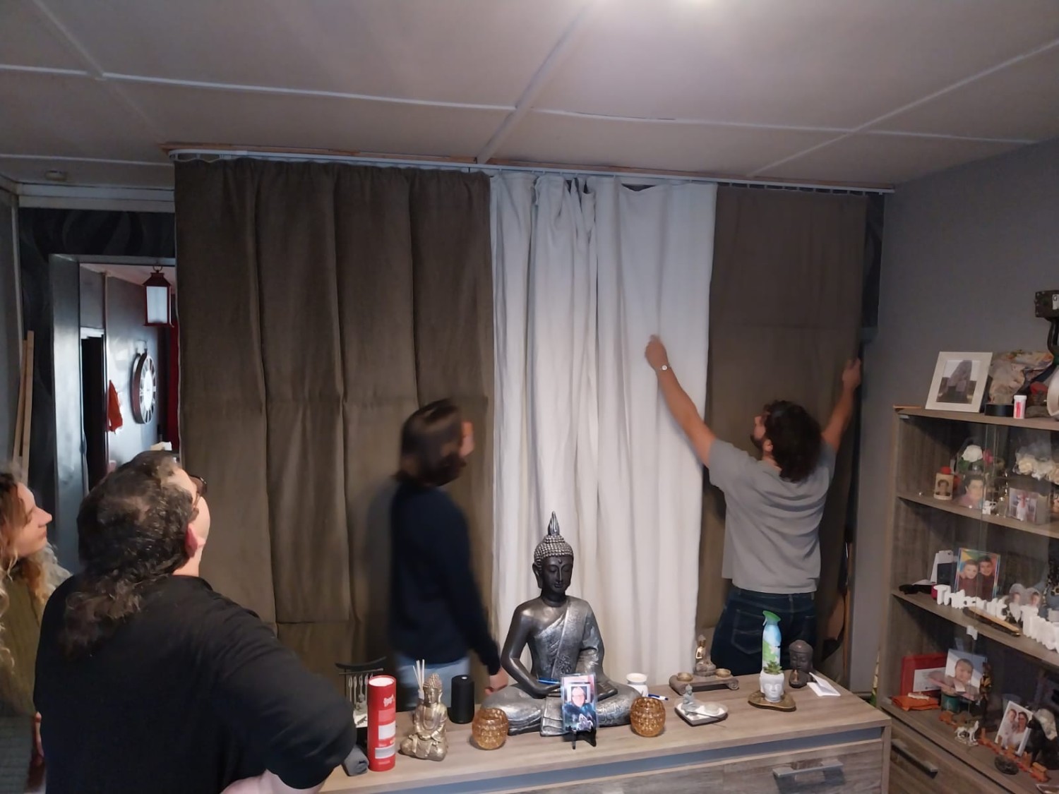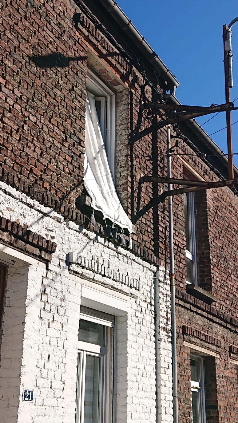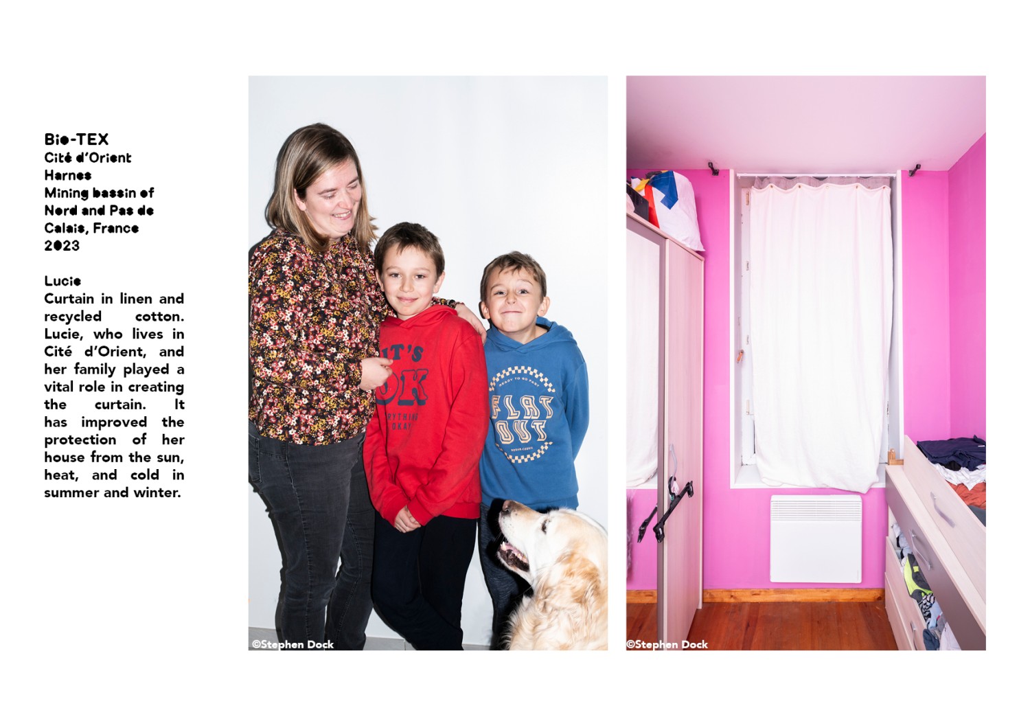 Rideau n3 "Chez Lucie" en lin fourni par LeMaîtreDemeestere et Safilin, ainsi qu'en coton recyclé fourni par "Atelier de matière". Installé dans la maison de Lucie, locataire dans la Cité d'Orient, elle et sa famille a activement participé dans la création du rideau. Maintenant, grâce au rideau, sa maison est mieux protégée du soleil et de la chaleur en été et du froid en hiver.