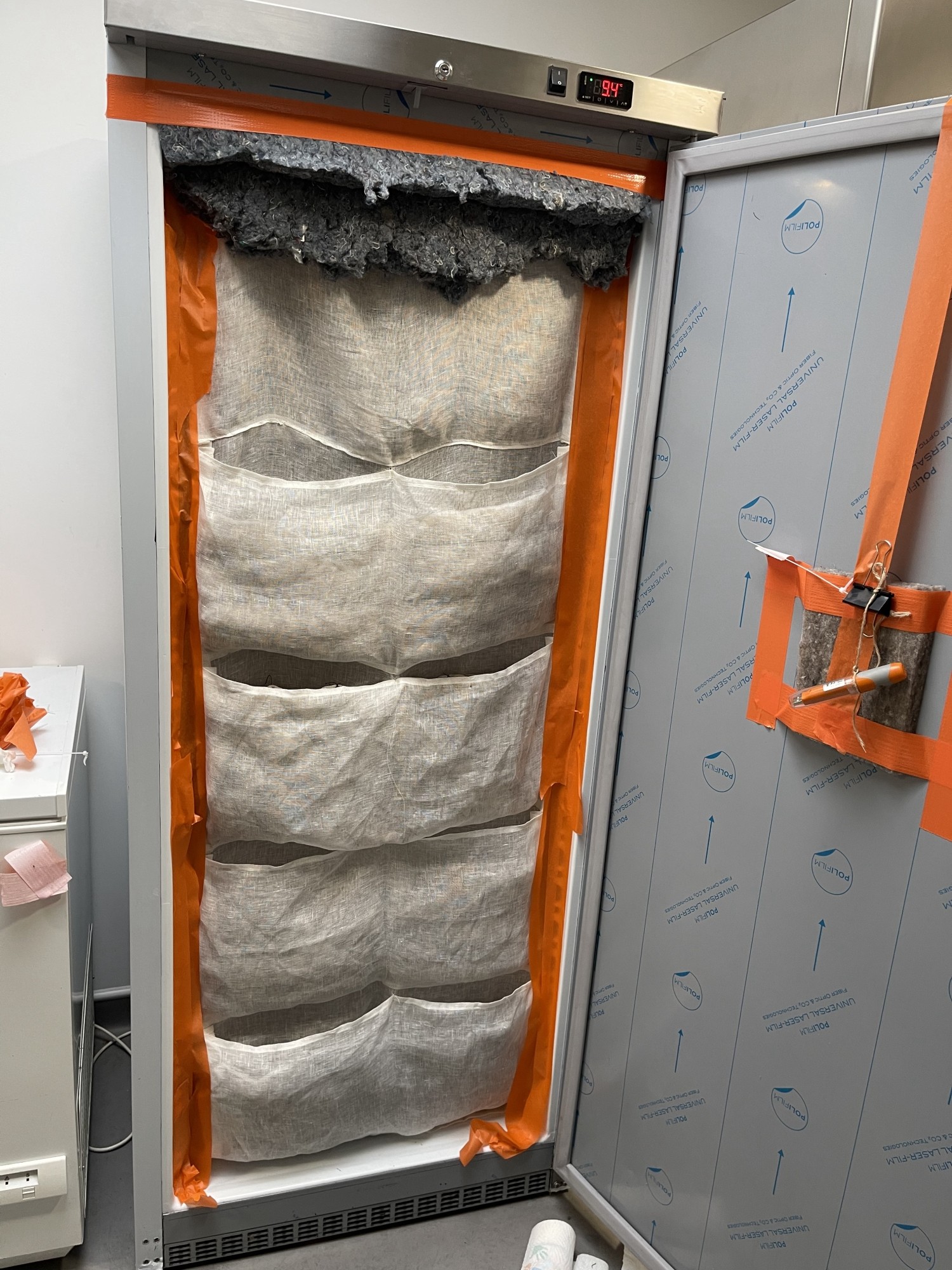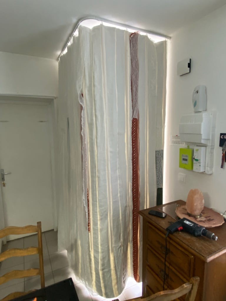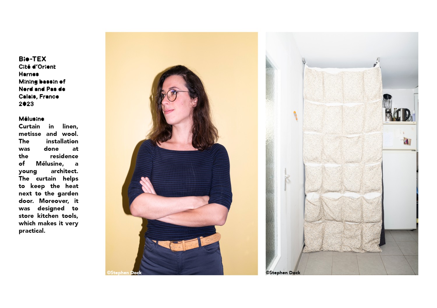 Rideau n4 "Chez Mélusine" en lin fourni par LeMaîtreDemeestere et Safilin, metisse fourni par LeRelais and EmmausFrance et laine fourni par WoolConcept . L’installation a été réalisée à la résidence de Mélusine, jeune architecte. Le rideau aide à garder la chaleur à côté de la porte du jardin. De plus, il a été conçu pour stocker des outils de cuisine, ce qui le rend très pratique.