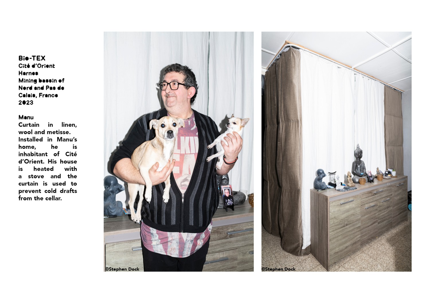 Rideau n 2 "Chez Manu" en lin fourni par LeMaîtreDemeestere et Safilin, laine fourni par WoolConcept et metisse fourni par LeRelais and EmmausFrance. Est installé dans la maison de Manu, habitant-locataire dans la Cité d'Orient. Il chauffe sa maison avec un poêle, le rideau permettra de retenir la chaleur dans le salon et de stopper les courants d'air froid venant de la cave.