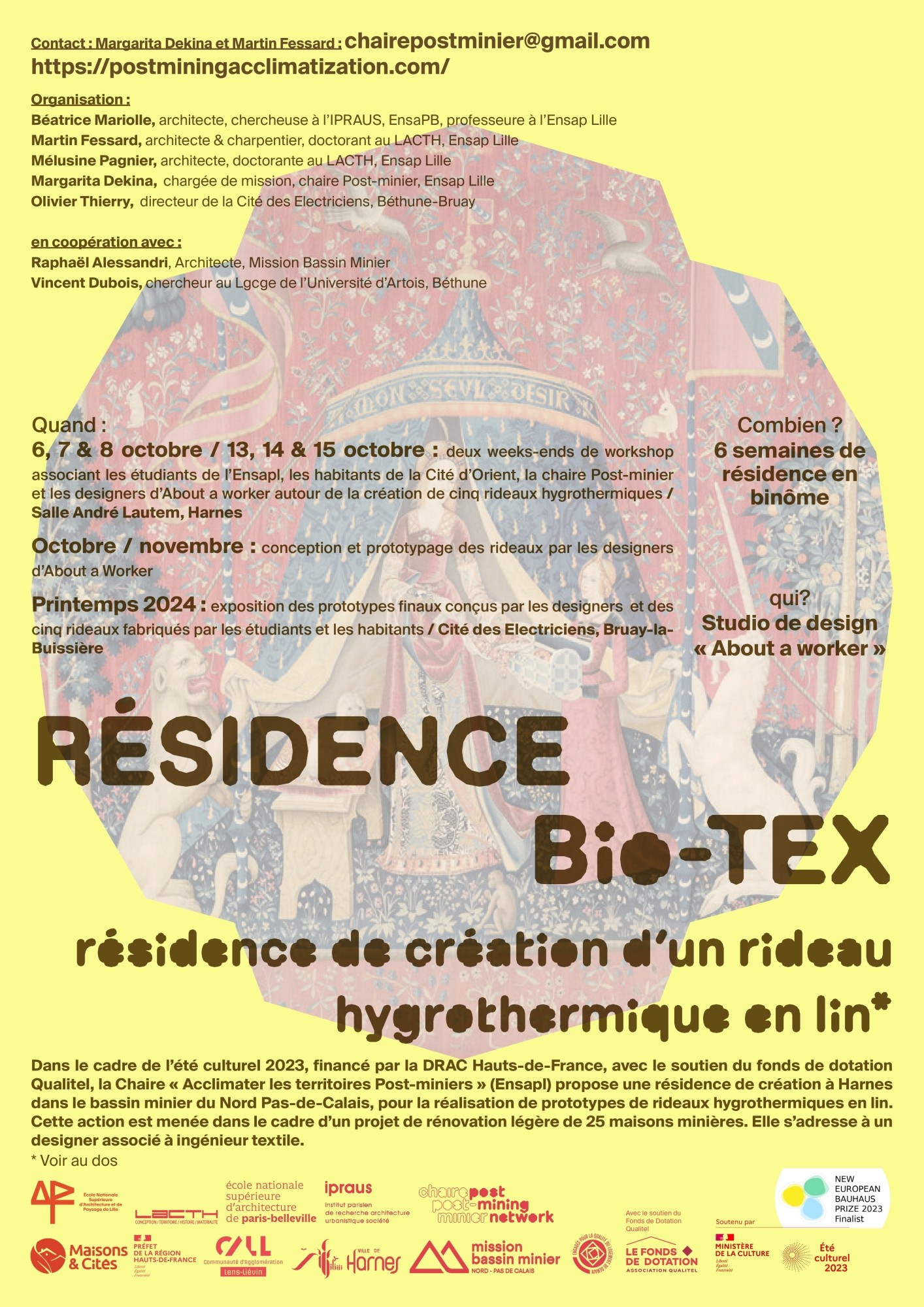 La Chaire « Acclimater les territoires Post-miniers » présente Bio-TEX, un projet innovant né dans le bassin minier du Nord-Pas-de-Calais. L'initiative, soutenue par la DRAC Hauts-de-France, les Journées Nationales de l'Architecture et le fonds de dotation Qualitel, s'est déroulée à Harnes dans le cadre de l'été culturel 2023.