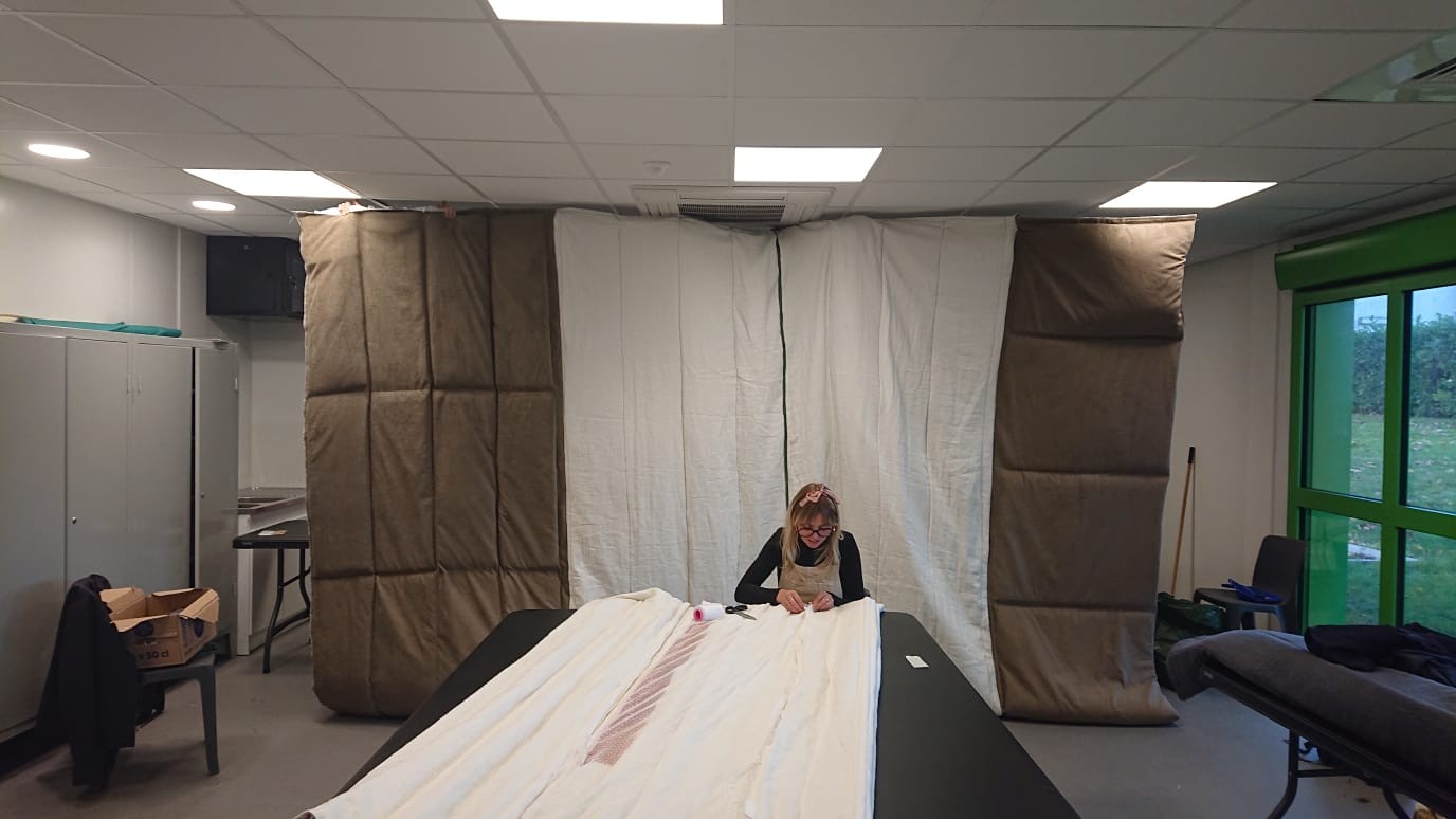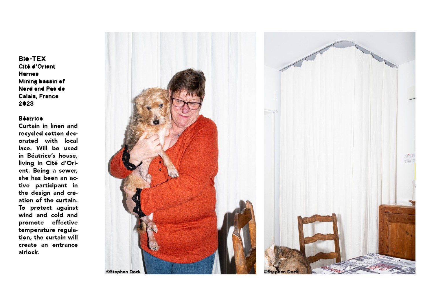Rideau n 1 "Chez Béatrice" en lin fourni par LeMaîtreDemeestere et Safilin, ainsi qu'en coton recyclé fourni par "Atelier de matière", décoré avec la dentelle fournie par Sophie Halette. Sera utilisé dans la maison de Béatrice, actuallement locataire dans la Cité d'Orient. Elle a activement participé à la conception et création du rideau qui permettra de créer un sas d'entrée afin d'assurer une protection contre le vent et le froid et favoriser une régulation efficace de la température.