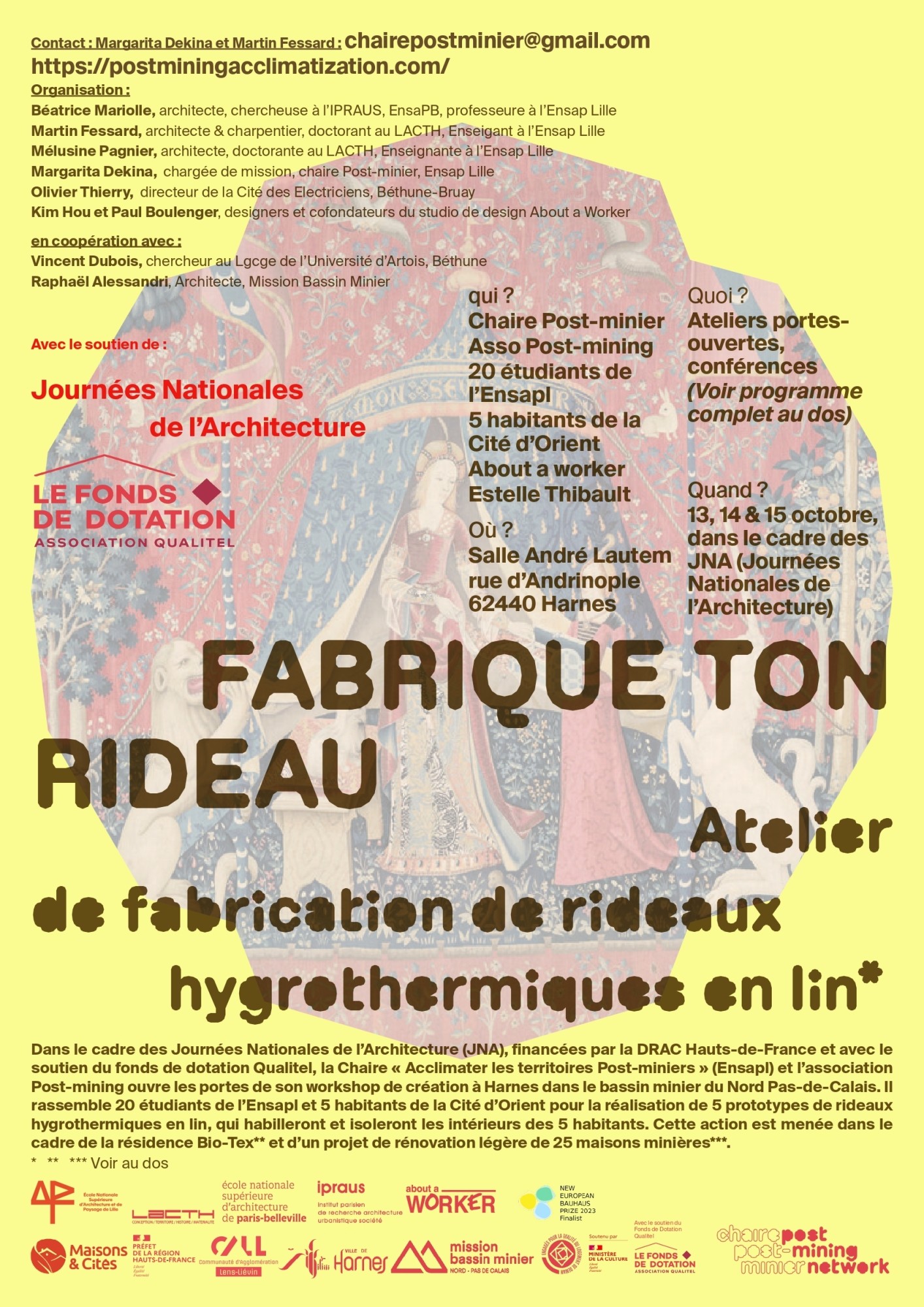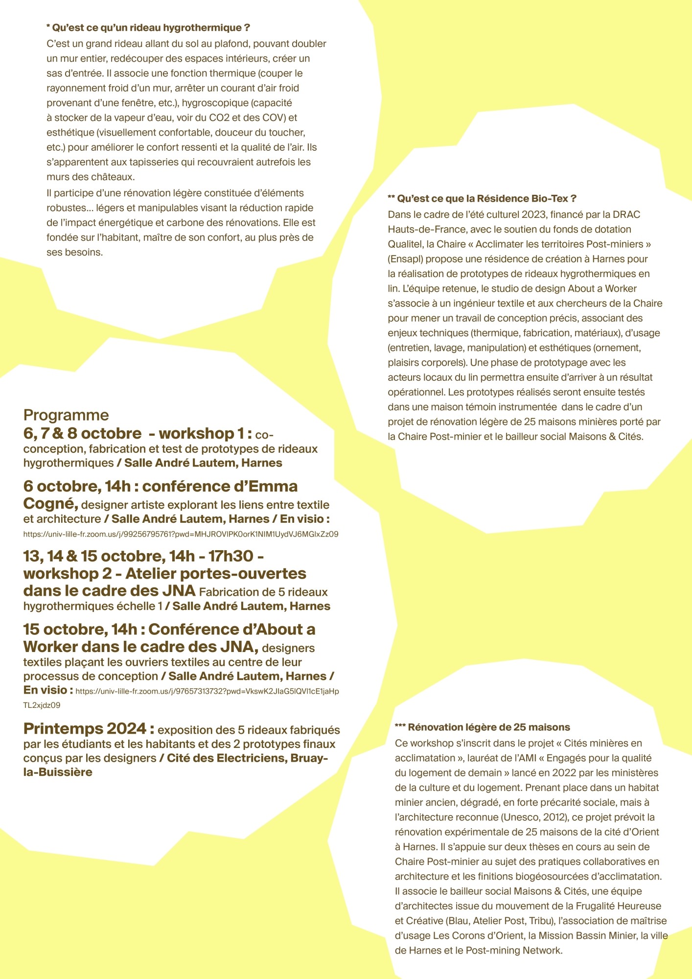 Bio-TEX a réuni une équipe pluridisciplinaire : 20 étudiants de l'ENSAPL, 4 résidents de la Cité d'Orient, les designers d'About A Worker, ainsi que des doctorants et professeurs de l'ENSAPL. Ensemble, ils ont conçu des rideaux hygrothermiques pour 4 maisons minières, alliant esthétique et isolation.