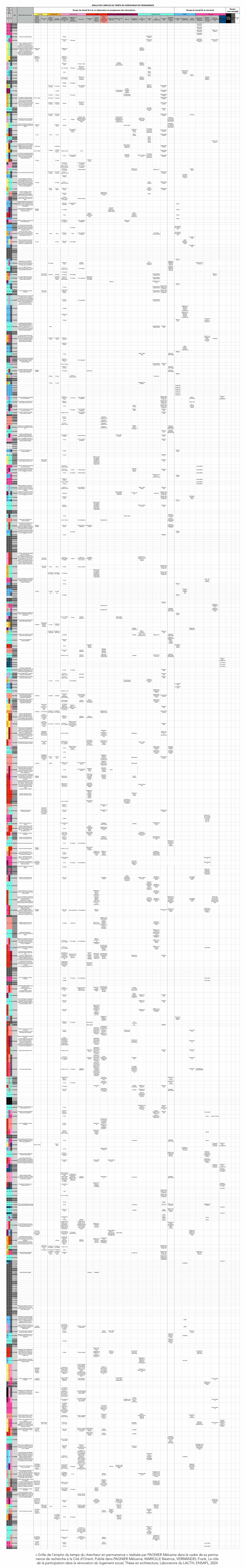 « Grille de l’emploi du temps du chercheur en permanence » réalisée par PAGNIER Mélusine dans le cadre de sa permanence de recherche à la Cité d’Orient. Publié dans PAGNIER Mélusine, MARIOLLE Béatrice, VERMANDEL Frank, Le rôle de la participation dans la rénovation du logement social, Thèse en architecture, Laboratoire du LACTH, ENSAPL, 2024