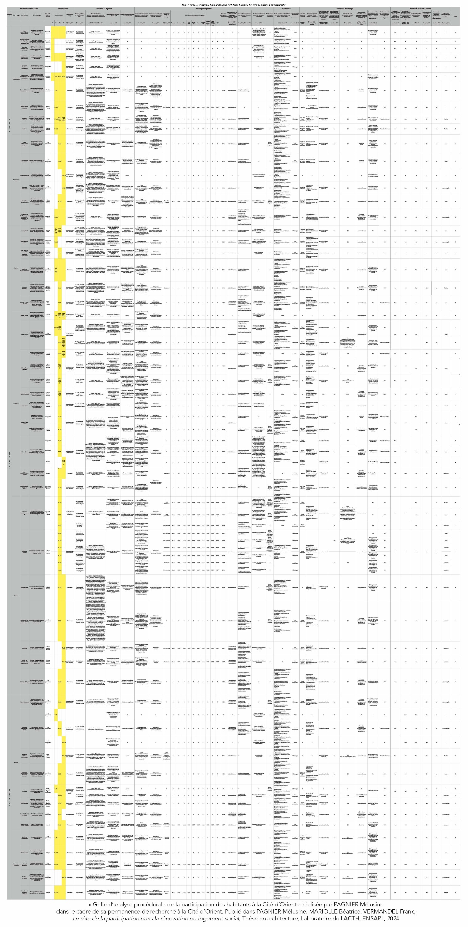 « Grille d’analyse procédurale de la participation des habitants à la Cité d’Orient » réalisée par PAGNIER Mélusine dans le cadre de sa permanence de recherche à la Cité d’Orient. Publié dans PAGNIER Mélusine, MARIOLLE Béatrice, VERMANDEL Frank, Le rôle de la participation dans la rénovation du logement social, Thèse en architecture, Laboratoire du LACTH, ENSAPL, 2024