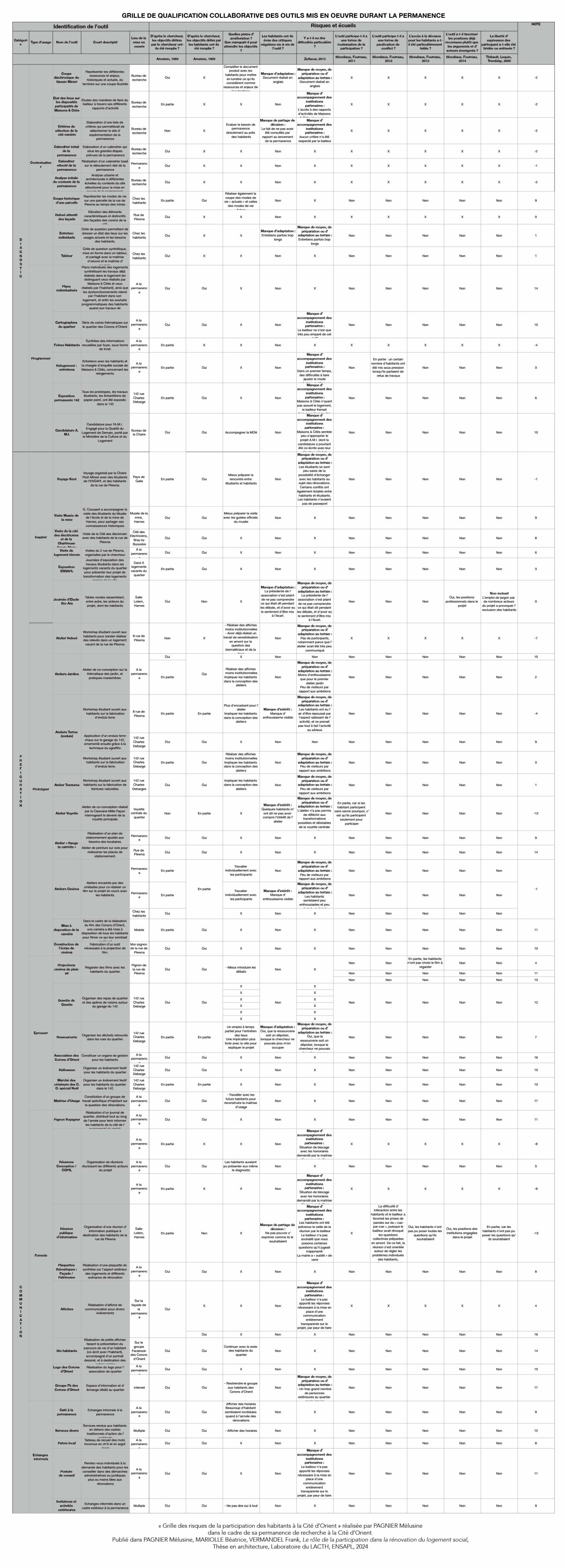 « Grille des risques de la participation des habitants à la Cité d’Orient » réalisée par PAGNIER Mélusine dans le cadre de sa permanence de recherche à la Cité d’Orient. Publié dans PAGNIER Mélusine, MARIOLLE Béatrice, VERMANDEL Frank, Le rôle de la participation dans la rénovation du logement social, Thèse en architecture, Laboratoire du LACTH, ENSAPL, 2024